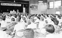 八日市市の「差別のない明るい町づくり第二十二回市民のつどい」(同実行委主催)が市立玉園中学校体育館で二十六日に開かれ、参加した約六百人の市民が人権作品発表、実践発表、人権高座などで差別のない明るい町づくりへ心を一つにした。