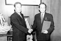 近江八幡郵便局(高谷修局長)は「防災の日」の一日、大地震などの災害時に市内を巡回している郵便配達員や保険外交員などが、業務中に知り得た災害の状況や対策に役立つ情報を率先して市に伝えることを相互協定する「覚書」を市と交わした。