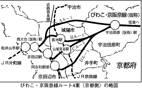 事業化への可能性調査結果を受けて期成同盟会は今後、実現へ既存鉄道の近代化と需要創出などのほか、京都側の京都府南部横断鉄道新線研究会(宇治・城陽・京田辺の三市と宇治田原・井出の二町で構成)との連携強化を図り、全線の地域からなる同盟会の結成にこぎ着けたいとしている。
