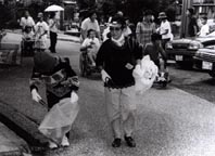 午前中、レクリェーション体操で体をほぐしたあと、昼食を一緒に囲んで懇談。午後からは日牟礼八幡宮までのクリーンハイキングに出かけ、道端にポイ捨てされている空き缶やゴミを拾い集め、観光客が多い名所や通りを中心にまちの美化に一役買った。普段、地域社会の人々にお世話になることが多い障害児たちが、できることから取り組む社会参加にさわやかな汗を流した。