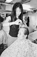 散髪は一人三十分程度で終了。お年寄りは頭の左右を鏡でチェックしながら、さっぱりした髪型に満足そうな表情を浮かべ、小松さんの特別サービスに感謝していた。