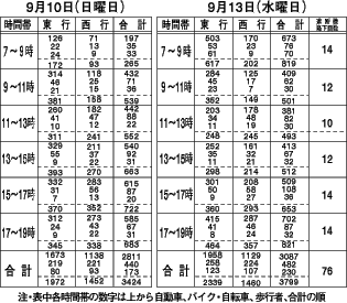 地域住民の安全が脅かされている現状を一刻も早く打開するため、同自治会と松尾踏切拡幅推進委員会の役員らが中心となって、実態を知ってもらおうと七月十七日、九月十・十三日(日曜日と平日)の三回、踏切の交通量の調査を行った=上表参照=。同時に、地元住民の声をまとめる署名活動にも乗り出した。