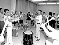 安土町の文芸セミナリヨ練習室で「安土信長出陣太鼓」教室が開講。基本練習に取り組む受講生の熱気と太鼓の乱打音が駐車場まで轟いている。