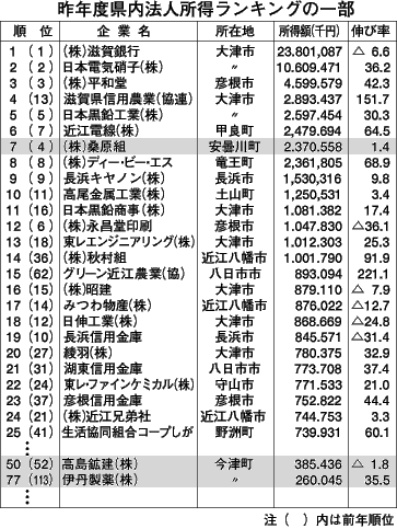 それによると高島郡内では、桑原組(安曇川町)が前年の四位から七位に落ちたもものトップ10入りを堅持した。また、前年五十二位だった高島鉱建(今津町)が五十位にランクアップ、伊丹製薬(今津町)がも年一~三位から大きくジャンプアップし七十七位となった。