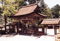 平安時代の創立と伝えられる同神社の大門は、室町時代前期の十四世紀中頃に立てられたものとみられる四脚門で、屋根は珍しい入母屋造り檜皮葺となっている。県内の四脚門では、愛知川町の豊満神社四脚門(鎌倉時代、重要文化財)に次いで古い。