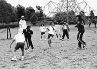 子どもたちは、芝生広場や遊具広場でサッカーやバレーボール、キャッチボール、ドッジボール、遊具を使って、大きな子も小さな子も、男の子も女の子もいっしょになって遊んだあと、お昼のお弁当を仲良く味わった。