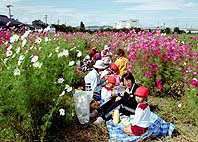 八日市市立八日市寺幼稚園(日永よし子園長)の親子約六十人が、このほどおにぎりをいっしょにつくって、さわやかな秋の風になびくコスモスの花の中で、実りの秋、食欲の秋をおなかいっぱい味わった。
