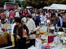 会場入り口には午前十一時前から少しでもよいものを安く手にいれようという市民が詰めかけ、オープンの合図とともにどっと会場になだれ込むと、お目当ての品がある場所に向かってダッシュするなど、会場は足の踏み場もないほどの大混雑。両手にいっぱい買ったものを抱え込む人、空いていいるスペースを見つけて買ったものを何十個も積み上げるグループなどの姿が見られた。