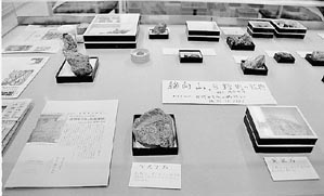 同展は、標高千百メートルにちなんで同町で制定された十日の「綿向山の日」を前に、綿向山の鉱物を知ってもらおうと開かれたもの。館内の陳列ケースには、国の天然記念物に指定されている高師小僧、珪灰石(けいかいせき)、オパールなど二十五種類が並べられている。
