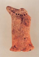 駅西区画整理事業に伴う発掘調査中に見つかったもので、土偶は素焼きの粘土製、高さ五・一センチ、幅三・二センチ。頭部や左腕、左胸は欠けた状態だが、右胸は女性を表現したように盛り上がっており、首元には首飾りをかたどったと思われる直径一ミリの穴が連なっている。