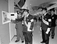 査察には、消防長をはじめ木村勝近江八幡消防署長ら5人の職員が同行。マイカル側からは山内豊一次長と警備会社の担当者が対応した。宇田消防長らは、山内次長の案内で映画館や各階店舗フロアー、カラオケ店など大勢の人が集まる場所を重点にスプリンクラーや防火シャッター、非常出口、店内の誘導表示などを見てまわり、万一の場合に安全体制が確立されているかどうか、説明を求めながら点検した。
