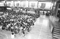 八日市市立八日市南小学校(山田栄治校長、児童数九百二十一人)では、午前九時から体育館で全校集会が開かれ、山田校長が百年前にはじめて製鉄が始まったこと、近江鉄道の彦根・八日市間開通など、時代の進歩と歴史の移り変わりにふれながら、二十一世紀になる年に生きていること、百年後はどんな社会になっているのか、「大きな夢と希望、志で新しい年を迎えよう」とあいさつ。「交通事故や病気にならないように、みんながまた元気で新学期に顔を合わせることができように」と、休み中の過ごし方について念を押した。