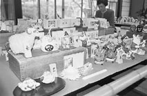 平成二年にはクジ付きの年賀切手も発売され、採用された民芸品の数は約八十点。同展では、初代「三春駒」(福島県)をはじめとするほぼすべての民芸品が、当時の切手と合わせて展示されている。