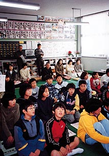 企画したのは同校六年A組の児童。この学習発表会は、総合学習の一環として行なわれたもので、グループごとにテーマを設定し、地域へ出かけてお年寄りから戦時中の話を聞いたり、図書館で調べるなどして、取材内容を壁新聞にまとめた。