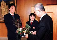三年生の大辻優君と小西智子さんから受け取った中村市長は、「毎年、立派な鉢植をありがとう。二十一世紀の幕開けに大事に飾らせていただきます」と話していた。