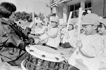 全日本太鼓連盟発足当時(七九年)、その加盟数は百十団体。九五年には約五百八十団体に膨れ上がり、現在は、加盟以外の団体も数えると全国で五千以上のグループが存在すると言われている。