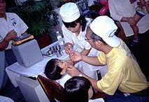 井田さん(八日市ロータリークラブ会員、五十四歳)は九四年十一月、第一回ポリオワクチン投与の対象地となったカンボジアに、事前調査団の中心メンバーとして加わった。翌年二月のカンボジアを皮切りに、モンゴル(九六年五月)、ネパール(九七年一月)、ラオス(九八年二月)、ベトナム(九九年一月)、そして昨年一月は中国とミャンマー国境でポリオワクチンの投与を行ってきた。