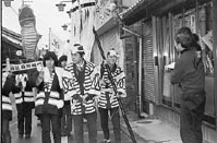 年賀状を手渡す局員は町火消しにふんし、それぞれ纏(まとい)を高くふりかざし、今年の干支・巳(へび)をあしらったユーモラスなみこしをかついで町内を練り歩いた。