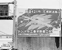 看板(縦一・五メートル、横二・七メートル)いっぱいに、鈴鹿山脈を通って近江八幡市(琵琶湖)と桑名市(伊勢湾)を結ぶ国道421号(石榑峠道路)の略図が描かれ、「トンネル工事早期着工を!」の文字が下部に大きく添えられている。