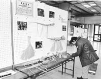 わら細工では正月の玄関を飾るしめ縄や干支の“巳”にちなんだしめ縄ヘビづくりの作品と、作業風景など、竹細工では、横笛、竹馬、竹とんぼなどの作品と作業を通じた子ども達とのふれあい、完成した作品で一緒に遊んだことなど、昔あそびでは、お手玉や水鉄砲など、手づくりのおもちゃで一緒に遊んだ思い出など、史跡めぐりでは、地域の歴史にふれたことなどが、参加した子ども達やお年寄りの楽しそうな表情をとらえた写真などと一緒に展示されている。