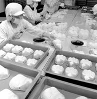 お菓子メーカー・「たねや」の本社工場(近江八幡市上田町)で、春を呼ぶ面菓子「富久豆」づくりが最盛期を迎えている。