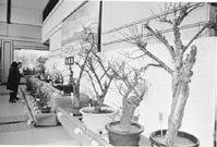会場には、「趣味の会」のほかに一般の参加者からの作品も並べられ、「野梅」「寒紅梅」「日月」など様々な種類の盆梅三十四点が一足早い春を感じさせてくれる。展示の中には、樹齢四十~五十年で、大人の背丈ほどある豪壮な古木も数点含まれ、見る人を圧倒している。