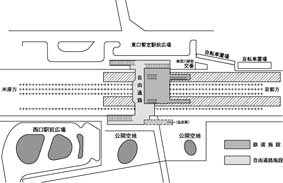 東西をつなぐ橋上自由通路と新駅舎内部の配置図
