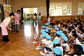 遊戯室に集まった園児約百四十人は、管理栄養士の大田初代さんと河本かよさんによる紙芝居「あさごはんで もりもりげんき」で、朝ご飯をしっかり食べることがいかに大切さかを知った。
