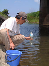▲河川の水を採取するNPO法人蒲生野考現倶楽部メンバー