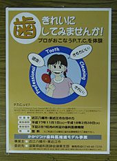 東近江市と近江八幡市の委託を受け「かかりつけ歯科医推進モデル事業」に取り組む滋賀県歯科医師会湖東支部(井田亮支部長、七十九歯科医療機関)は、両市の住民三百人を対象に、歯科医や歯科衛生士が専用の機械を使って歯面清掃するPTC(プロフェッショナル・トゥース・クリーニング)ヘの体験者を募集している。この「歯スッキリ体験ツアー」ヘ二月末までに申し込めば、費用(各歯科医院先着六人)は無料となる。