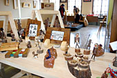 メモスタンドや土笛などの粘土細工から、皿、コーヒーカップ、どんぶりなどの実用食器、かわいい動物や昆虫たちや大型の置き物、間伐材や木の実などでつくった人形、座り心地のよさそうないす、やさしい手触りとぬくもりを感じさせる木馬、棚などのほか、生徒の書・絵画・心に浮かんだ言葉などの作品が収められた壁掛けやフォトスタンド、牛乳パックを再利用してつくったペン立てやメモ帳といった作品に、訪れる観光客らも目を奪われ、お気に入りの作品を見つけては手に取り、一つ、二つと購入して行く。