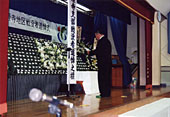追悼式は、二度と戦争遺族をつくってはならない―の思いから、同支部の遺族三百二十六人が開いたもので、来賓に岩永峯一衆議院議員、奥村展三衆議院議員、山下英利参議院議員、上野幸夫県会議員、小寺裕雄県会議員、小杉武志県会議員、山田利治県遺族会会長らが参列。満州・ボルネオ・レイテ島などで亡くなった三百九十八人に対し、恒久平和の社会と、ふるさと東近江の繁栄にまい進することを誓った。