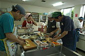 ▲野菜の皮むきに悪戦苦闘しながら、和気あいあいと調理する男性受講者ら