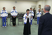 大会への出発に先立ち市役所で激励会が行われ、中村功一市長が「生きがいを持って人生をどう過ごすかが大切です。皆さんが精一杯がんばられることが、東近江市の元気につながります。頑張ってきてください」と激励の言葉を送った。