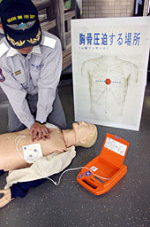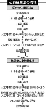 東近江行政組合消防本部でも、指導内容を十月一日から新しいものに変更しており、応急手当講習会で手作りのパネルなどを使って指導、普及に努めている近江八幡消防署の林勝美救急広報係長は、「知識として持っていても、いざというときにはなかなか行動に移せない。また、一度講習を受けても使う機会がなければすぐに忘れてしまう」と、二年に一回程度の定期的な受講を呼びかけている。また、そんな場面に遭遇したら、「一一九番にとにかく通報してもらえば、電話で的確に指導します」と、話している。