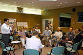 市長と車座談義」を今年度から取り組むことになり、このほど市立図書館で近江八幡おやじ連(木ノ切秀雄代表)との第一回談義を開いた。