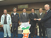 同組合では四年前から古紙、段ボール、アルミ缶の資源回収に取り組んでおり、それらの売上金全額を中村功一市長に手渡した。