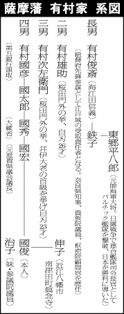 となると、有村家を継ぐのは四男・國彦となる。國彦は東京に出て、第五銀行頭取を務める。その後、國太郎、國秀と続き、國宏が父。