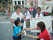 七月の「ごみ減量強調月間」を機に、東近江市と同市さわやか環境づくり協議会は、先月二十六日夜の第三十九回八日市聖徳まつり総おどり会場で、「生ごみひとしぼり」と「携帯マイ箸(はし)」運動の啓発活動を行った。