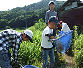 調査では、地元のお年寄りから、機械や農薬に頼らずに農耕していた頃の話しを聞いた後、子どもらは早速、網を持って田んぼへ飛び出した。
