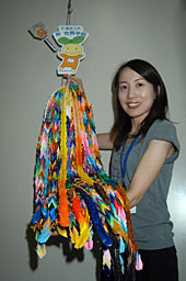 千羽づるを結び付ける部分は、子どもたちに平和の尊さや戦争の悲惨さを語り継いでもらおうと願って、市のこども施策キャラクター「こども未来ちゃん」と、平成十七・十八・十九年の大凧まつりで掲げられた「非戦の誓い」大凧のミニチュアを取り付けた。