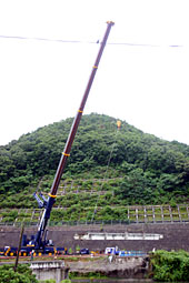左岸に設置された最大吊上荷重六百五十トン、アームの長さ約六十メートルという油圧式クレーンとしては国内最大級、国内に六台しかなく、県内での稼動は今回が初めてという超大型クレーン車を使って、九等分されたコンクリートげた(約二十三トン)を、一本ずつつり上げ、二日間かけて解体した。