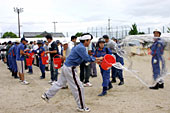 ▲バケツリレーの訓練に参加する住民――馬淵小学校で――
