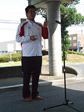 トルコ・イズミールで開催される「第一回世界ろう者陸上競技選手権大会」(今月二十三~二十八日)に出場するハンマー投げ日本代表・森本真敏選手(23)=竜王町山之上=の「激励壮行会」が四日、竜王町総合庁舎玄関前で開かれた。