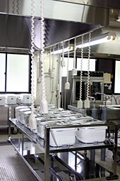 事業開始に向けて整備された給食室の設備や、一年生と二年生の教室での配膳準備などを見学した後、ランチルームで三年生と炊きたてのご飯の給食を味わった。