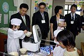 給食後には中庭で、五・六年生による「炊きたてご飯」開始セレモニーも開かれた。松村副社長は「皆さんに使っていただけるのを心から喜んでいます」とあいさつし、北京オリンピックの日本選手もご飯がエネルギーの源になっていたことを紹介して「ご飯をおいしく食べて、大きく、元気に、育ってもらいたい」と、願いを込めた。