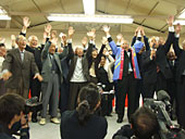 当確の知らせが中嶋氏の事務所に届くと、詰め掛けた支持者からどっと歓声と拍手が沸き起こった。