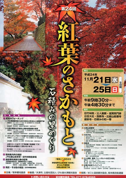 第二十四回「紅葉さかもと・石積みの里めぐり」(坂本観光協会の主催)が二十一日から五日間、延暦寺や日吉大社、西教寺のある大津市坂本地区一帯で開催される。