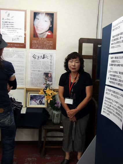 青木さん(大津市在住)の場合は、平成十三年三月三十一日、二男の悠君(当時十六歳、高校一年生)が、十七歳と十五歳の少年らのグループに「高校の入学祝をしてやる」と呼び出され、市内の小学校校庭で二時間に及ぶリンチを受け、四月六日に亡くなった。和代さんは悠君の無念の思いや母親としての心情などを話すと共に「生命のメッセージ展」に出展。一昨年夏には、大津市の中学生のいじめ自殺問題を機に「ジェントルハートメッセージin大津」展を企画・開催した。