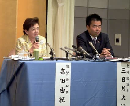 また、嘉田知事は「滋賀の自治を守り、滋賀らしい政治グループ」として、政策研究集団「チームしが」を提案。これに対して、三日月衆院議員は「今の中央政権でやっていることを滋賀に持ち込めばいい、この道しかないという独善的な政治運営、行政運営に私は強い危機感をもっている。それに対抗して、多くの人がチームをつくり活動するいい提案だ。みなさんといっしょにつくっていきたい」と賛同した。